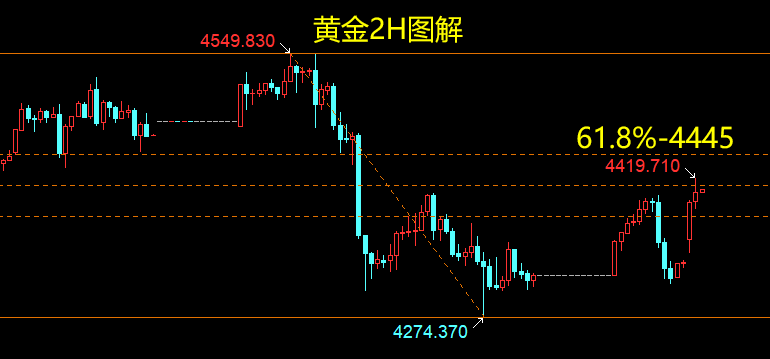 黄金,大趋势接周评分析所述,2025年价格受地缘政治危机及美联储降息提振持续上行,年终最高至4550承压,目前处于回撤周期,待支撑确认后会再次冲高试阻;早盘受周末消息面影响高开高走至4421,短线偏强,非农前关注4550-4274连线61.8%反弹点4445附近攻防;若有效承压,则仍会回落盘整;若强势上破,则会重返4550;