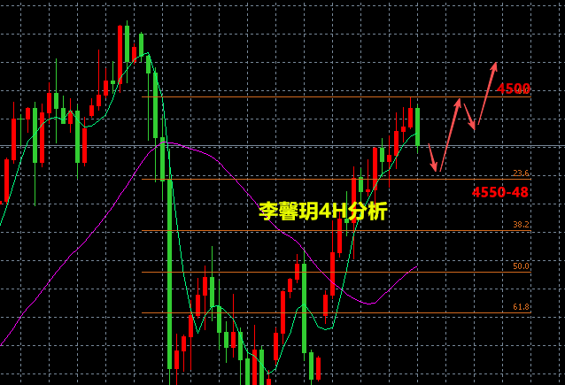 1.7 黄金昨日目标4500早间开盘后到达,期间短线虽有反复迂回,但整体保持慢牛上升格局,符合馨玥思路预期,今日早间冲高4500回落,由于是整数关口压力,先看短线调整力度,确认支撑后再接多,结合当前基本面及地缘局势来看,上涨还未结束,回落都是接多机会,4H周期中,指标暂时钝化粘合,震荡上升支撑带在4450、4435,操作上回踩做多为主,企稳上攻再看4500、4520、4550,一旦突破前高位置,接下来就是4600-4650再到4700这些位置,在当前的全球局势之下,今年都是很有机会到的!