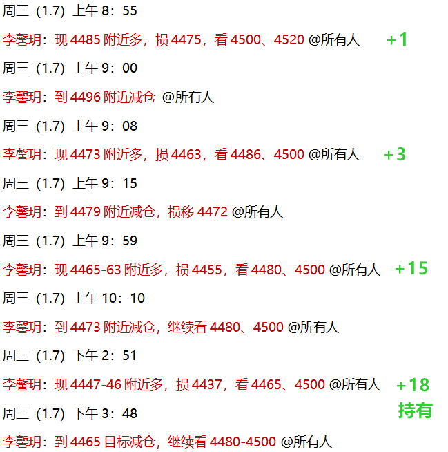 1.7 周三,公开策略中黄金4460多单,如期到4480目标;4450多单到4460也有不错利润!实盘中,早间先安排了4485多单,到4496减仓获利!而后4473多单又在4479减仓获利!再然后公开现价4465-64多单,到达4480止盈目标!目前4447-46多单,也到达4475获利,减仓后持有中!今日多单四连胜,实盘全部获利,风控做好的前提下实力加持,稳步前进中!