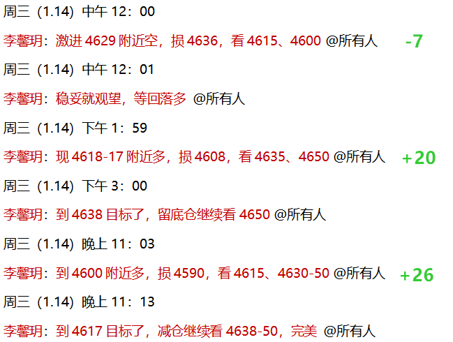 1.14 周三,晚间策略黄金4600做多精准兑现,触及后拉升,又是公开大赚利润!今天中午先安排了4629激进空单,在4636扫损!午后小幅回踩,公开安排4618-17多单进场,顺利到4638目标止盈!午夜按策略又安排了4600多单,上涨至4627获利减仓再赚!今日一损两盈,收获39点利润,多单完美节奏!偶尔有止损正常,只要整体操作方向没有偏移,轻松做回来!