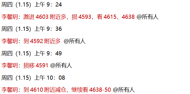 1.15 黄金昨晚4600策略多单,午夜如期到达4638止盈目标,大幅获利!日线隔夜收阳,小幅突破新高的同时伴随反复下探迂回,短线呈现宽幅扫荡格局,碎阴碎阳循环,是中继回升的形态结构,而基本面同样不支持大跌,所以,即便回落也是接多机会,4H周期中,布林收口表现,指标拐头钝化偏空,但形态上横盘抗跌,以时间换空间的形式修正,修正结束后还会继续上涨,今天还是顺势低多跟进,支撑关注4589、4570、4555,跟进回落力度接多!早间实盘中,4603多单扫损4593;而后4592多单,目前已到4615获利减仓!