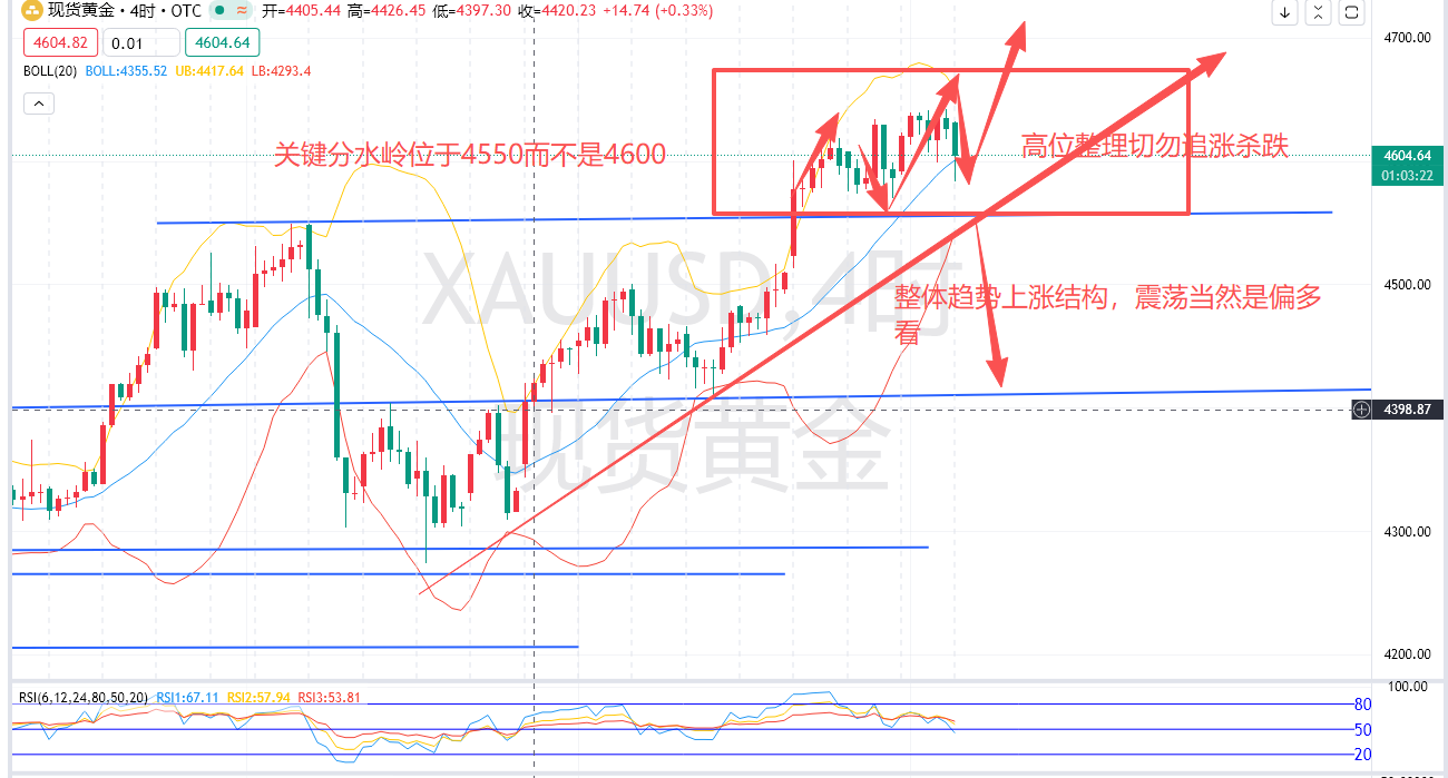 据CME“美联储观察”:美联储1月降息25个基点的概率为5%,维持利率不变的概率为95%。到3月累计降息25个基点的概率为26%,维持利率不变的概率为72.8%,累计降息50个基点的概率为1.2%,官方对于本月降息的可能性不大,美联储利率维持不变的话对金银本身的涨势影响不大,届时还是要看会议内容是否带动后续的降息节奏,但在目前截止议息期间来看,金银能够保持涨势的话,就还有很大的上升空间技术上,4550之上保持看涨,同时也是确认4542中期顶部的关键一环,目前价格陷入震荡整理,也是高位多头的整理所以且不要过早预期顶部,技术上其实没太多要说的继续顺势,4550失守再说,总而言之日内操作上,目前位置价格不做参与,上方再次新高也得看美盘,所以短空也是有机会进行的,4635-40区域继续空目标4600破位看4680-70区域了结即可,下方4580-85(轻仓多),60-55补仓多下坡4550损,目标看50-100个点!建议大家耐心等待机会!
