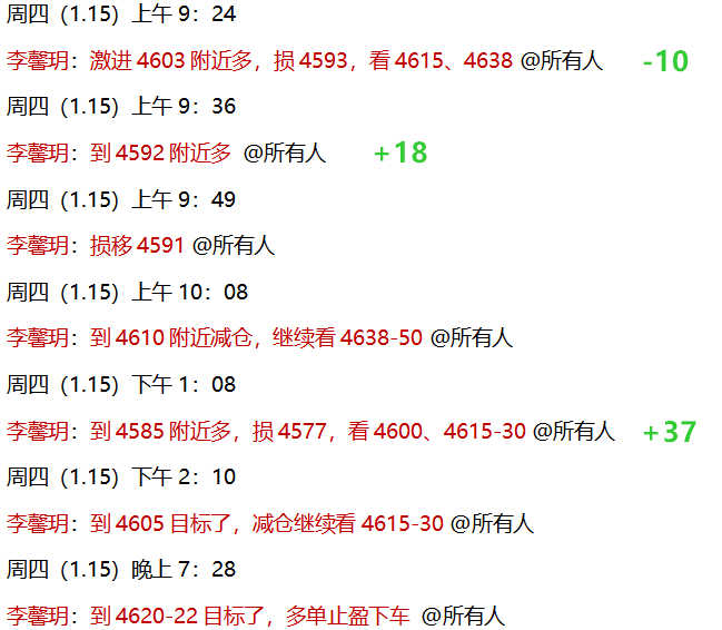 1.15 黄金昨晚4600策略多单,午夜如期到达4638止盈目标,大幅获利!今日策略4589做多,午后已拉升4613附近,又是20点以上利润!实盘中,早间的4603多单,扫损4593出局;随后安排的4592多单,到达4610-15目标获利!午后再次下探,公开安排了4585多单,拿到晚间到4622止盈出局!今日三连多,整体收获45点,并且实操公开,大赚全网见证!