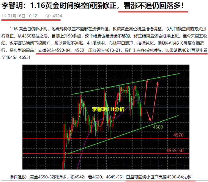 1.16 周五,公开策略黄金4590支撑做多,基本符合回踩低点,到达4615附近有不错利润空间!晚间来看,窄幅震荡中进一步收敛,以时间换空间高位横盘强修正,但考虑到周五收线,白天越是平静,美盘就越容易走极端,所以,看涨的同时,也要谨防出现插针式调整,操作上主多辅空对待,支撑带在4570-80,如果下破再看4550-55顶底转换和上升236位置,压力关注4618-21,如果站稳4621再逐步看至4645、4655!