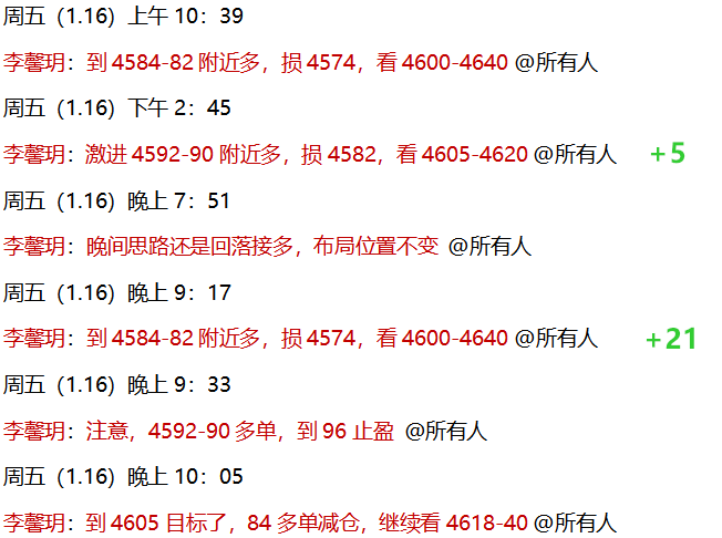1.16 周五,公开策略黄金4590-84多,完美预判下探回升,粉丝朋友连赚不止!实盘中,早间安排的4584-82多单,和午后安排的4590,晚间提示计划不变,美盘前下探全部进场,到4607-08减仓持有!日内多单两连胜,已斩获36点利润!本周圆满收官,策略全部兑现,公开实操从头赚到尾!