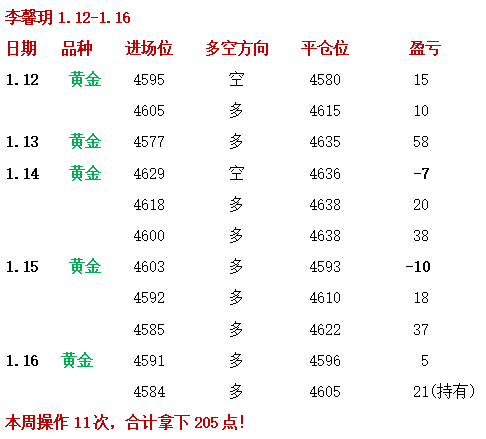 1.12 周一,欧盘公开安排的黄金4595短空单,在4580收割利润!美盘前破高,实盘又在4605-04跟进多单,到达4615-20附近再获利!今日多空连胜25点,本周开门红!