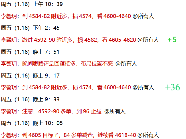 1.16 周五,公开策略黄金4590-84多,完美预判下探回升,粉丝朋友连赚不止!实盘中,早间安排的4584-82多单,和午后安排的4590,晚间提示计划不变,美盘前下探全部进场,顺利到4618-20目标止盈离场!多单两连胜,斩获40点利润,并且完美规避盘尾下探回升!本周圆满收官,策略全部兑现,公开实操从头赚到尾!