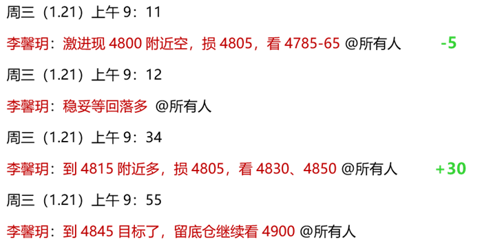1.21 黄金昨日早间企稳4660上涨,整日又是百点涨幅,日线收饱满大阳,开始连阳放量,今早小幅回踩4758后继续上扬,截止目前拉高至4845,前面讲过的4900中期目标已经接近,虽然看涨,但实际难点在于持续强势中,短线难有参与位置,所以,最好是等待合适机会入场后,波段持有,馨玥近期40-50点的波段多单也拿了不少。今早实盘中,先安排在4800关口尝试短空,扫损4805;而后安排的4815多单,顺利到4845目标获利!早间多头火力全开,今日顺势继续做多看涨,支撑关注4800、4766-58、4730,上方中期目标依旧4900!