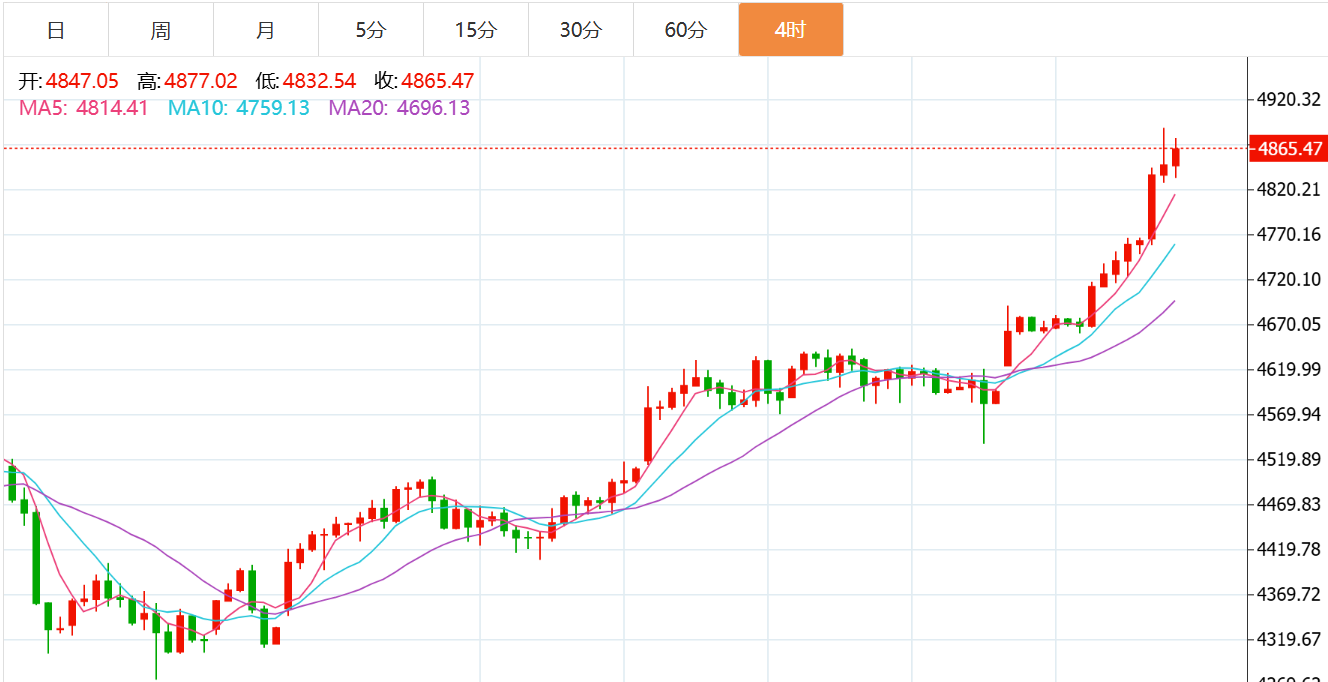 黄金技术面分析:黄金昨日早盘4672附近先回落,日线最低触及4659一线后受到避险消息刺激行情强势拉升,日线最高触及4766一线整理,日线最终收线在4763一线以一根下影线稍长的大阳线收线。今天还是低多为主,早盘直接反弹最高触及4843一线,建议回落日内低点附近可以做多。走强的话,顶底转换4765附近多,目前在日线走势上几个突破前期的高位震荡区间之后,K线继续沿着短周期均线维持在震荡偏强一些走势,日线走势上关注下有没有调整修复之后的延续拉升走势。4小时级别走势上K线基本贴着短周期均线维持较好的震荡上行走势,盘中回落的力度和延续度都不算太大,在短期走势上暂时还没有看到见顶的迹象。小时级别走势上走出高位横盘之后的二次拉升,短周期均线继续维持勾头向上发散,短线走势上在连续的拉升之后注意下短线的调整情况。综合来看,黄金今日短线操作思路上贺博生建议以回踩低多为主,反弹高空为辅,上方短期重点关注4890-4910一线阻力,下方短期重点关注4840-4820一线支撑。