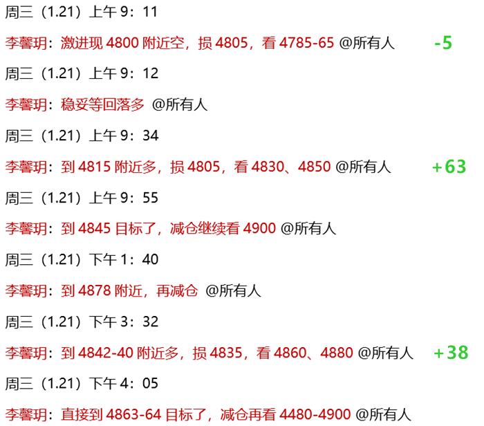 1.21 周三,公开策略继续看涨黄金,已接近之前强调的4900中期目标!实盘中,今早先安排的4800短空,扫损4805;而后安排的4815顺势多单,已到4878波段获利,减仓持有中!欧盘前下探,公开安排了4842-40多单,持有至晚间到达4880目标!今日两连多,再抓波段利润,已斩获96点!公开现价单,全网见证!