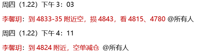1.22 周四,按策略思路,欧盘前公开安排了黄金4835空单,目前已到达4816获利,减仓持有中!晚间按白盘思路不变,黄金局部有修正需求,后半周将围绕4888高点之下进行迂回震荡修正,同时配合回踩修正指标。4H周期中,连阴收口,形态同样偏空,支撑关注4755、及4744-32支撑带,操作上主多辅空对待,上方压力关注4835-38、4890。