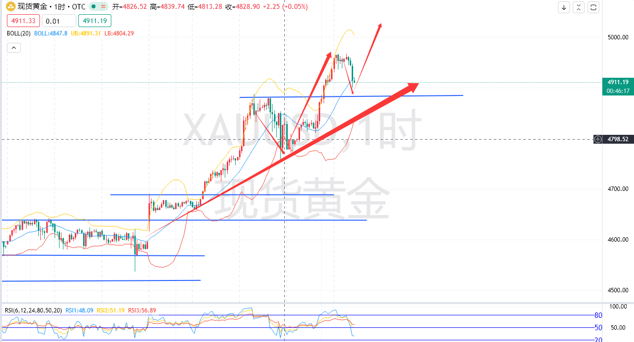 总体而言,多单4910附近区域多,根据自身资金条件4900-4885补仓多,下破4880损,目标4935-40-4970破位看5000