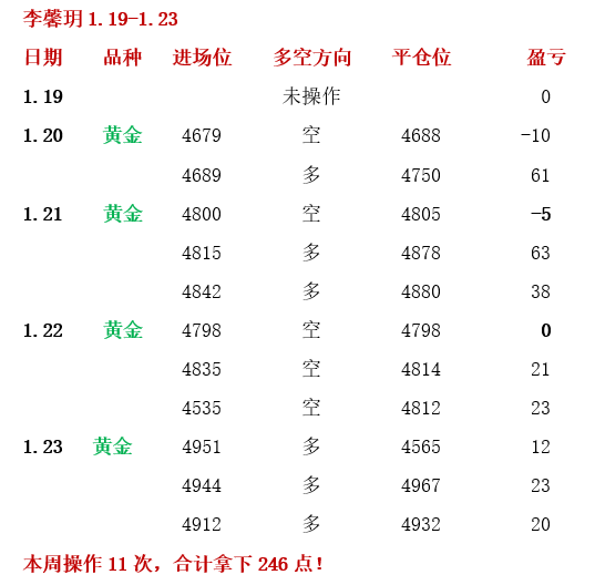 1.23 周五,实盘中,早间先安排了4951多单,顺利到4963-65目标获利!而后又安排了4944多单,也到4967目标获利!欧盘承压下探后,安排了4912多单,晚间到达4925-50目标止盈!日内三连多,本周圆满收官,斩获48-73点利润!每日操作真实呈现,拒绝套路,从不弄虚作假!