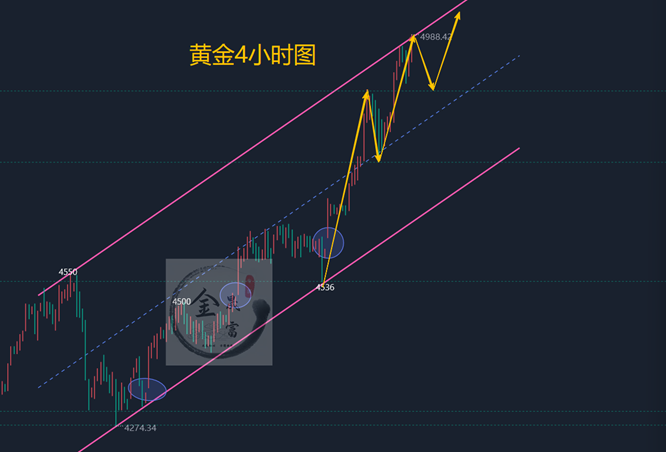 那么接下来黄金会到哪呢,我想说,上不言顶,不管是5100还是5400,这个让市场去做决定,我们就是回落干多,下方支撑在4900附近,也就是布局北上的位置;技术面还是那句话,不用看都是多头走势,全部都是大阳线起飞,底部呈现圆弧底的形态,k线始终站稳均线,始终踩着均线上行,能够从4900附近拉升到4990,多头的强势不用说了,下周回落继续多为主;综合来看,今日黄金短线操作思路上金晟富建议反弹做空为主,回调做多为辅,上方短期重点关注5000-5030一线阻力,下方短期重点关注4900-4910一线支撑,各位朋友一定要跟上节奏。要控制好仓位及止损问题、严格设止损,切勿抗单操作。具体点位以盘中实时为主,欢迎前来体验,交流实时行情,进群关注实时单。