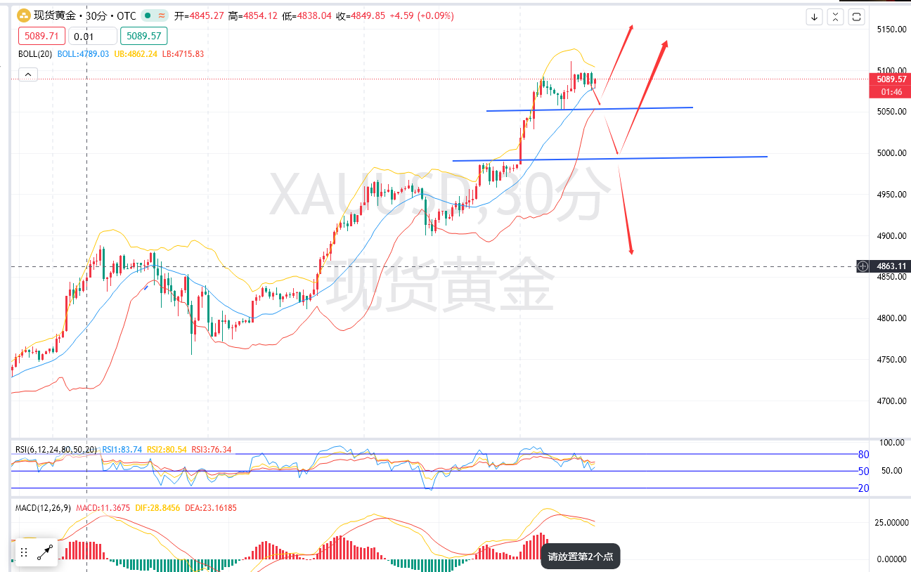刚才的那段5110冲高承压,5100-5110区域短空也算是得到了验证。接下来若调整,要关注5055的初步守强支撑的得失。若进一步破位,则不排除有回去缺口的可能。回调线上呢,其实已经失效了,但是失效前,初步支撑位于5055,午盘几乎是恰好的。所以结合一下,下方关注5055—65的前低得失。次要支撑则位于5013—18范围内,属于小时图布林带中轨即将运行的区域。这就可以了,其他杂七杂八的太多总会太乱。当然,缺口什么的,就见仁见智吧,只要实体不下5000,时间就还得拉扯到周四!更多具体操作建议加入梦圆实盘给出!