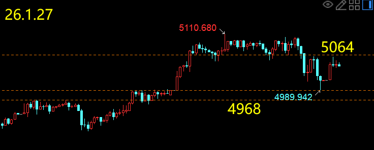 黄金,年初价格自4310受地缘危机避险提振走强,后因关税战刺激加速上破4800-4900关口,周评强调日图结构为多,但技术指标偏离,预期后市会在刺破5000关口后走调整;周一实际冲高5110后隔夜回落4990,日图未见明显转折,4H图呈现抛售风险;