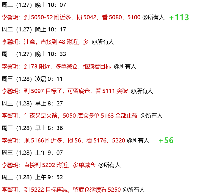1.27 周二,晚间公开策略5050做多,冠绝全网,目前到5082已有30点利润!跟上又是赚到,实力全网公开验证,拒绝马后怕!实盘中,早间拉升后安排了5063多单,在5071获利减仓!午后横盘强整理,继续安排了5061多单,顺利到5100目标止盈!晚间终于到达看了一天的5050做多位置,没有犹豫直接进场,拉升到5097获利后,留底仓隔夜在5163波段止盈!三连多,又斩149点以上利润!本周策略接连应验!