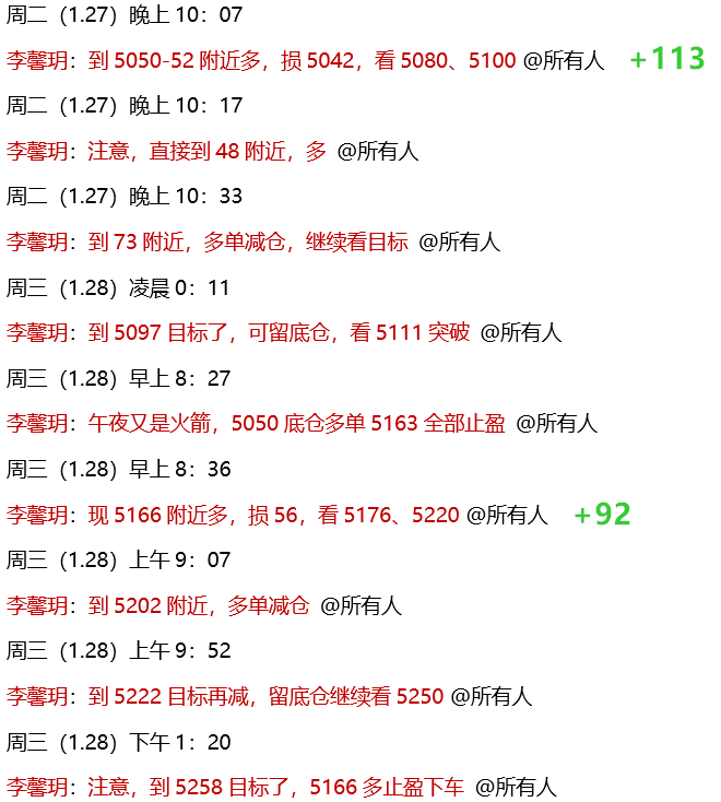 1.27 周二,晚间公开策略5050做多,冠绝全网,目前到5082已有30点利润!跟上又是赚到,实力全网公开验证,拒绝马后怕!实盘中,早间拉升后安排了5063多单,在5071获利减仓!午后横盘强整理,继续安排了5061多单,顺利到5100目标止盈!晚间终于到达看了一天的5050做多位置,没有犹豫直接进场,拉升到5097获利后,留底仓隔夜在5163波段止盈!三连多149点利润!本周策略接连应验!