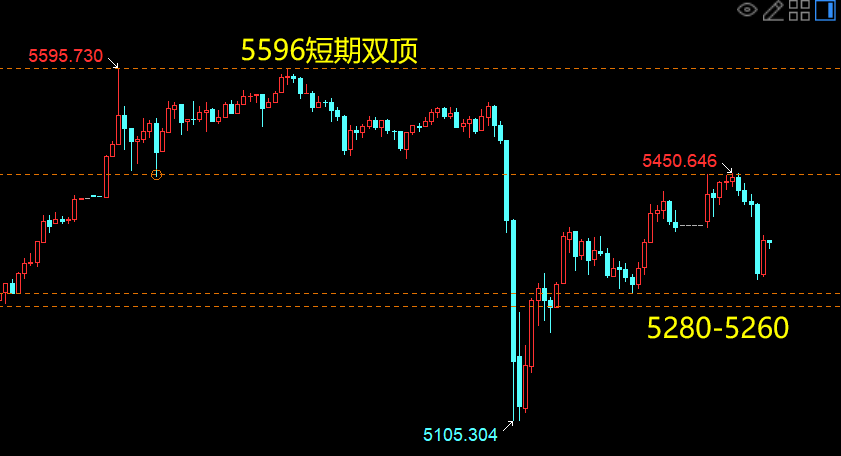 早盘于5450回落,白盘短线支撑5300,强支撑5280及日图MA5-5260,破位下看5238至5105;短线阻力5375-5400,强阻5420-5450;