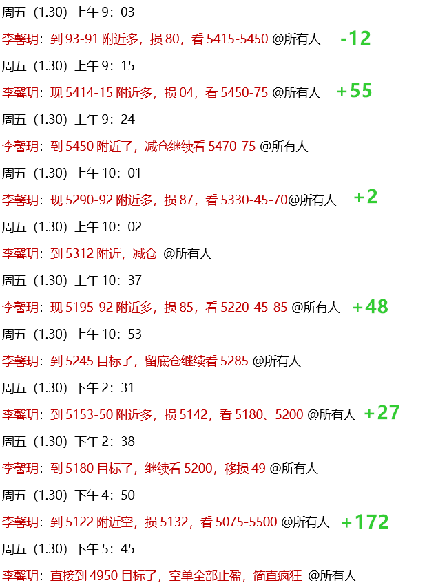 1.27 周二,晚间公开策略5050做多,冠绝全网,目前到5082已有30点利润!跟上又是赚到,实力全网公开验证,拒绝马后怕!实盘中,早间拉升后安排了5063多单,在5071获利减仓!午后横盘强整理,继续安排了5061多单,顺利到5100目标止盈!晚间终于到达看了一天的5050做多位置,没有犹豫直接进场,拉升到5097获利后,留底仓隔夜在5163波段止盈!三连多149点利润!
