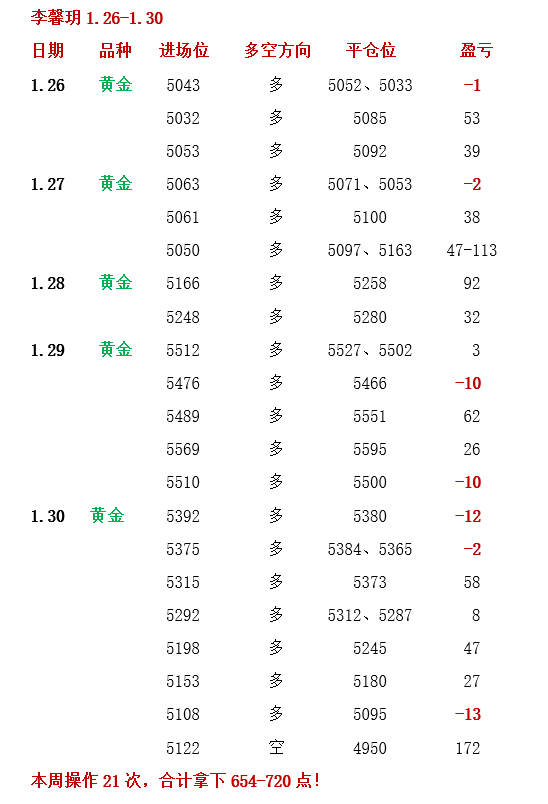 1.30 周五,黄金亚盘时段,按早间宽幅区间思路,实盘中安排几波多单,虽然有出现止损单,但整体仍收获了108点!但在欧盘下破5110昨晚及日内低点后,我们果断转向,小幅反弹后安排了5122空单,大跌4950目标止盈,172点利润收入囊中!这也是本周唯一一次做空,圆满收官!