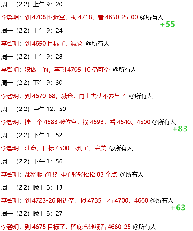 2.2 黄金今日低开后,下探触及4699后拉升4885,周评文章中给出的4700做多兑现,又是185点利润空间,跟上就赚到!实盘中,早间连续安排的4708空单,在4650目标获利!午间安排的挂单4583破位空单,在午后顺利进场,到4500目标止盈!到欧盘短线承压4734,正是策略中提及的压力位,果断在4726跟空进场,到达4675-60目标止盈! 日内空单三连胜,斩获201点,开门红大赚到手!