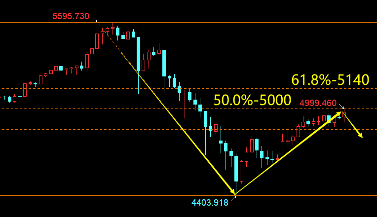 早间开市4947后冲高,现报4990;白盘时段短线支撑4950-4930,强支撑4880-4860;短线阻力5596-4404连线50.0%反弹点5000,强阻5100及61.8%反弹点5140,在此之下维持看弱思路;