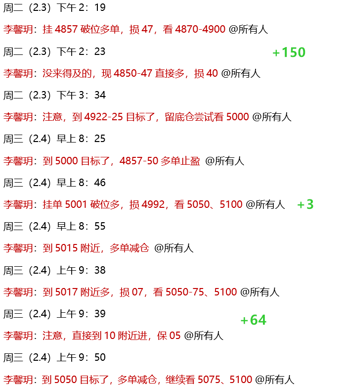 2.3 周二,早间策略讲过,突破4900将冲击5000关口,目前已到4950附近!午后4894也如期承压,回落4865也有不错利润空间!实盘中,先是早间安排的4814、4830多单都有减仓利润!再次安排的4830多单扫损4822!午后安排的4857-50破位多单,顺利到4925目标减仓,隔夜到5000目标止盈,整体收获150点利润!思路看涨目标,如期到达!