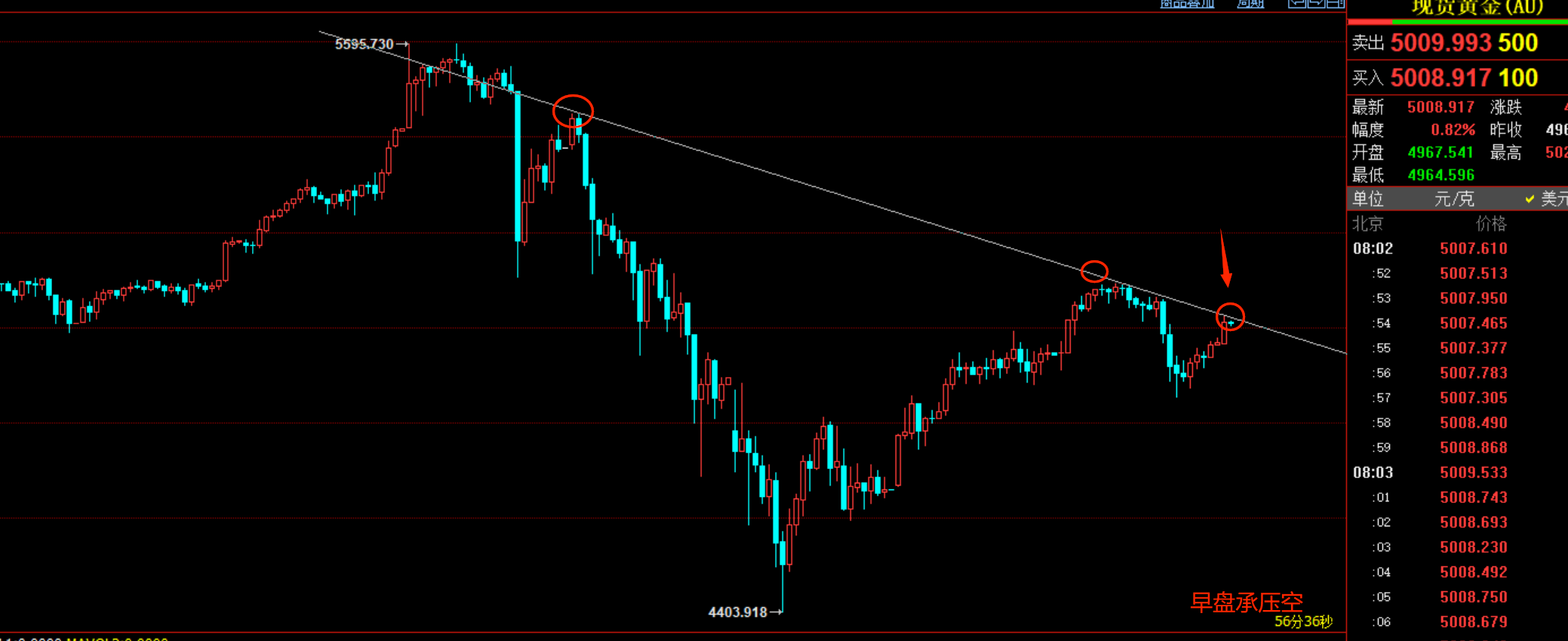 黄金从周一大跌,再到周三反弹,本周黄金整体趋势偏高位震荡,大趋势还是多头,结合黄金周三上涨幅度,从技术角度来看,黄金依然存在下跌空间,如图短期黄金承压于下跌趋势线,可以反弹后分批做空黄金,即关注5020和5050的压力位,早盘可以跳空高开,高空看缺口回补。