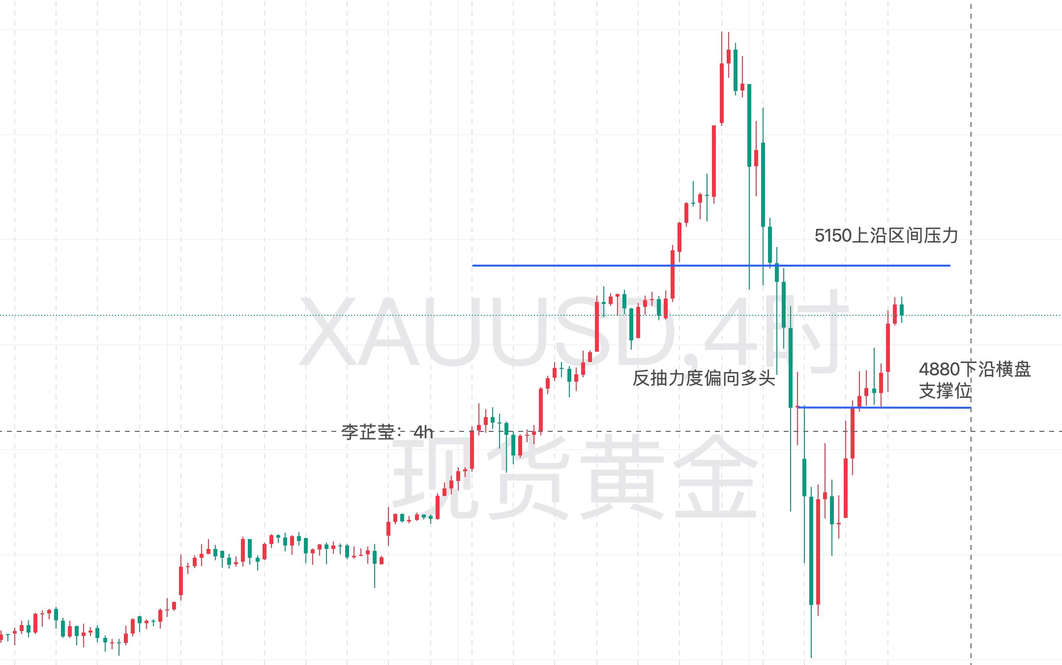 操作上,我们需重点关注上方 5150 的关键压制位,下方则是早盘反复提及的 4880 分水岭。下午有人觉得这个区间跨度较大,但回顾近期行情,全天振幅 1000 美金都属常见,少的时候单边也能走出 500 美金,相比之下,当前这个区间实在算不上大,稍有波动就可能突破。