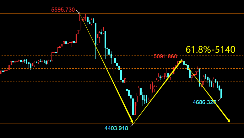 周中实际于5091转弱,周四延续下行,日图结构呈空头排列,晚间非农延续下看;早间开市4780回落,白盘时段短线阻力4760,强阻4790-4810;短线支撑4690-4590,强支撑4403平行低点,破位下看日图下轨4200及周图中轨4100;