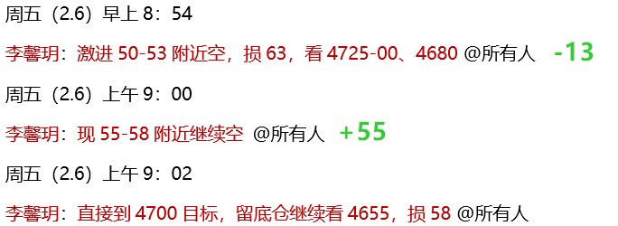 2.3 周二,早间策略讲过,突破4900将冲击5000关口,目前已到4950附近!午后4894也如期承压,回落4865也有不错利润空间!实盘中,先是早间安排的4814、4830多单都有减仓利润!再次安排的4830多单扫损4822!午后安排的4857-50破位多单,顺利到4925目标减仓,隔夜到5000目标止盈,整体收获150点利润!思路看涨目标,如期到达!