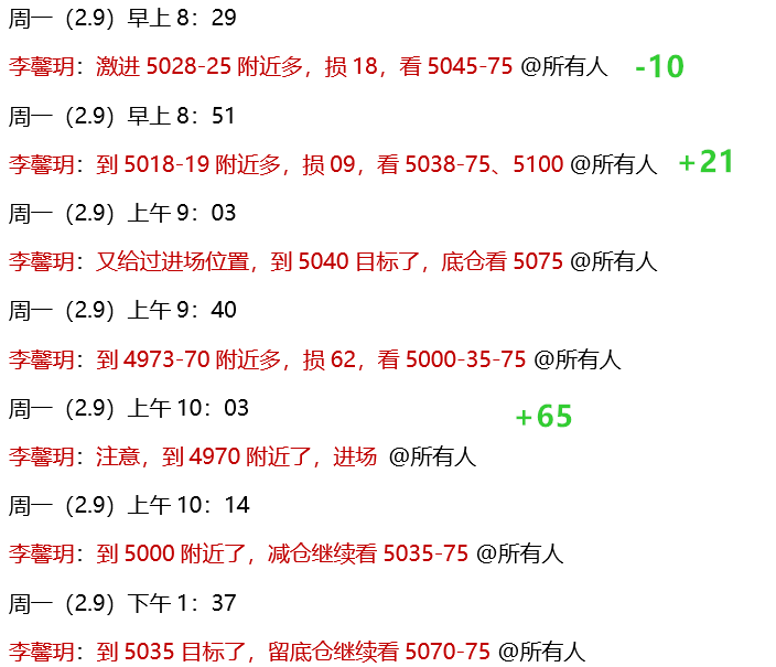 2.3 上周二,早间策略讲过,突破4900将冲击5000关口,目前已到4950附近!午后4894也如期承压,回落4865也有不错利润空间!实盘中,先是早间安排的4814、4830多单都有减仓利润!再次安排的4830多单扫损4822!午后安排的4857-50破位多单,顺利到4925目标减仓,隔夜到5000目标止盈,整体收获150点利润!思路看涨目标,如期到达!