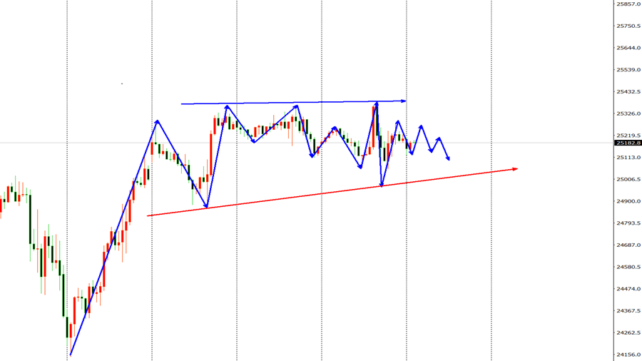 纳指市场昨日开盘在25175.08美元,后行情先回落给出25055.42美元,后行情拉升,日线最高触及到了25380.7美元,后行情回落,日线最低给到了25969.47美元,后尾盘拉升,日线最终收线在了25202.04美元,后日线以一根上下影线等长的长脚十字星形态收线,而这样的形态收尾后,纳指依旧处于承压格局。综合来看,高博景总结:纳指上涨没有进一步突破,有进一步承压的概率,今日重点关注阻力位效果,操作上考虑反弹做空为先,低多为辅,上方关注25300-25500美元阻力,下方关注25050-24880美元支撑。