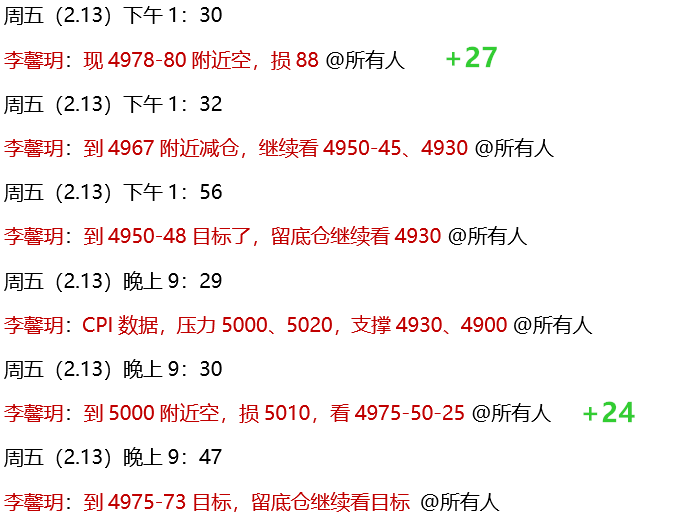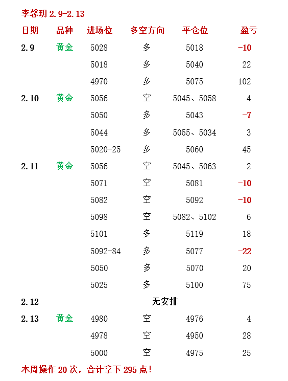 2.13 周五,黄金公开策略依托5000-97做空,日内多次触及后,均有不错回落空间!实盘中,午后安排的4978空单,顺利到4950-48目标!晚间按公开策略,又安排了5000附近空单,也顺利到4975-73目标获利!整体落袋50点,周五圆满收官!本周一到周三,低多全部精准大赚,周四波幅清淡没有安排,周五高空又是连续兑现收割!公开策略全网见证,恭喜关注的朋友,过年前再吃肥肉!