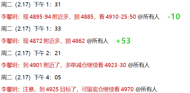 2.17 今天是大年初一,祝大家新年快乐,财源广进,马到成功,事事顺心,成功上岸!实盘中,午后先是安排了4895-94多单,急跌扫4885防守!而后继续安排了4872多单,顺利拉升4940附近大幅获利!晚间关注能否有效站稳4930中轴压力,站稳再看4970、5000压力,反之承压继续向下突破,再配合日线连阴,或将进一步打开下行空间。
