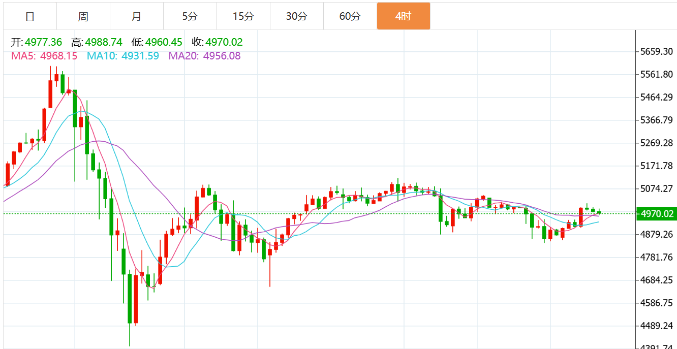 黄金小时线级别:今天早间触及4953企稳,一路连阳拉升,有些小单边的走法,欧盘承压昨晚最后一次开跌口4944,出现滞涨横盘的迹象,则就容易回落修正一波,也顺利抓了一波回踩,本来提示了4910是顶底转换支撑,触及稳定可延续拉升,但还是相对保守去尽量靠近中轨4900及下再去尝试北上,结果就踏空了,最低4906;那么此时再度破日内高点,今晚就要回踩找位置继续北上,关注两个支撑,一个是顶底4940附近,一个是4924,618或短期均线位置,阻力目标往上是4970下一个开跌口,再往上是4990-5000靠近红色通道2号线反压点;综合来看,黄金今日短线操作思路上贺博生建议以回踩低多为主,反弹高空为辅,上方短期重点关注5030-5080一线阻力,下方短期重点关注4920-4870一线支撑。