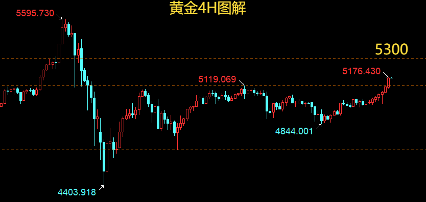 黄金,年初价格自5596前高抛售4404,二次下探4655后转入盘整;文中强调在5596-4403连线61.8%节点5140关键攻防上破前,维持看弱思路;上周连续震荡后受美伊局势及关税战避险提振重返5000,早间开市后延续放能突破5140,4H图结构强势,周初延续上看5250-5300阻力区间,能否突破5300上攻5596需留意国际形势变化;