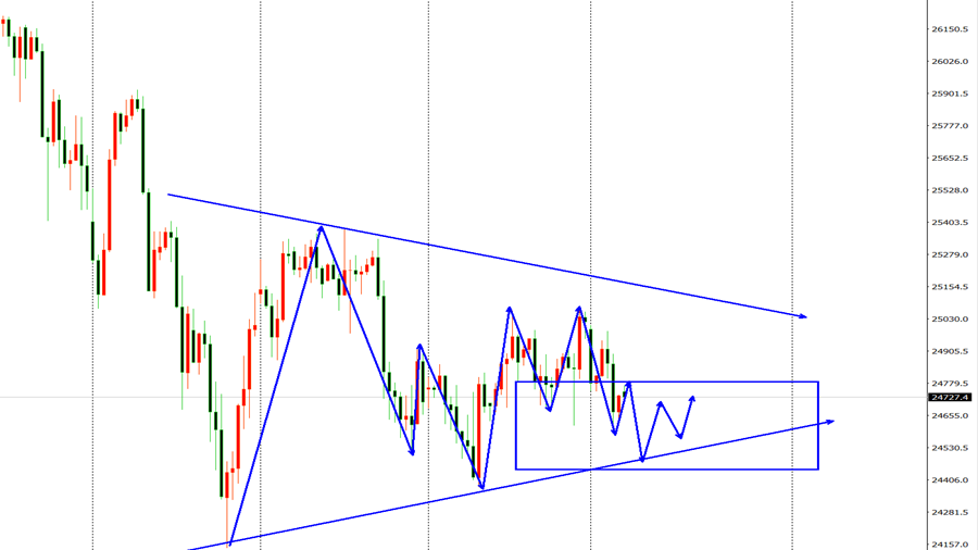 纳指市场昨日开盘在24987.15美元,后行情小幅回补缺口给出25005美元,后行情强势回落,日线最低给到了24606.74美元,后整理,日线最终收线在了24729.22美元,后,日线以一根下影线很长的大阴线收线,而这样的形态收尾后,日线阴包阳,纳指再次出现了震荡趋势。综合来看,高博景总结:纳指运行在均线打压中,但是箱体底部一直没有下破,有进一步震荡的概率,今日操作上考虑反弹做空为先,低多为辅,上方关注24783-25087美元,意外上破之后有望改变空头格局,下方关注24600-24380美元支撑。