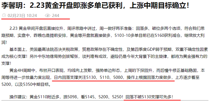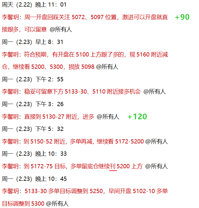 2.23 黄金早间开盘后直接拉升,周评思路中讲过,周一做好两手准备:回落多、破位多两个选项,符合我们思路预期,实盘中,周末提前安排过,黄金等周一开盘就直接做多,早间5103-10多单到5200获利减仓,波段继续持有!欧盘前,公开策略5130多单也进场,隔夜持有至5250目标全部止盈!日内连续做多拿下210点利润!公开策略完美兑现,冠绝全网!