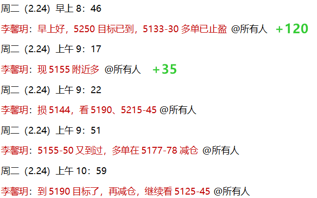 2.23 黄金早间开盘后直接拉升,周评思路中讲过,周一做好两手准备:回落多、破位多两个选项,符合我们思路预期,实盘中,周末提前安排过,黄金等周一开盘就直接做多,早间5103-10多单到5200获利减仓,波段继续持有!欧盘前,公开策略5130多单也进场,隔夜持有至5250目标全部止盈!日内连续做多拿下210点利润!公开策略完美兑现,冠绝全网!