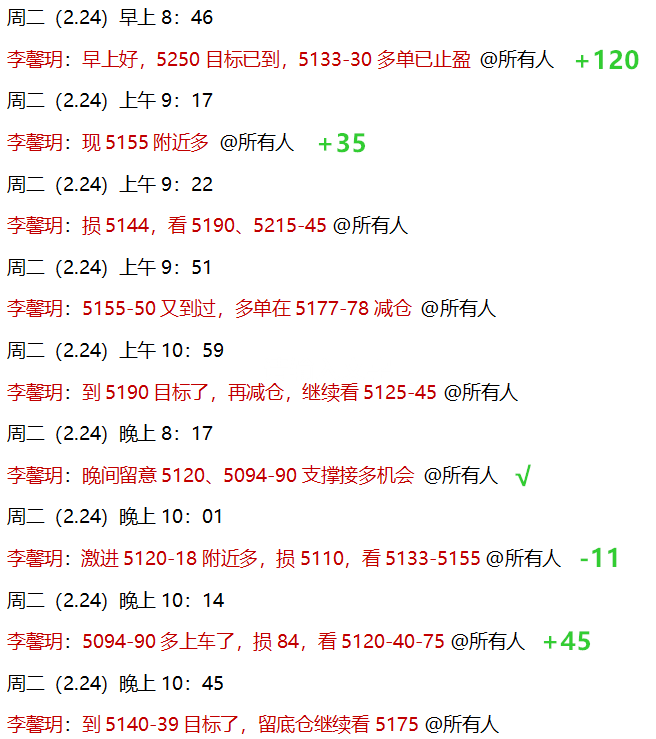 2.23 黄金早间开盘后直接拉升,周评思路中讲过,周一做好两手准备:回落多、破位多两个选项,符合我们思路预期,实盘中,周末提前安排过,黄金等周一开盘就直接做多,早间5103-10多单到5200获利减仓,波段继续持有!欧盘前,公开策略5130多单也进场,隔夜持有至5250目标全部止盈!日内连续做多拿下210点利润!