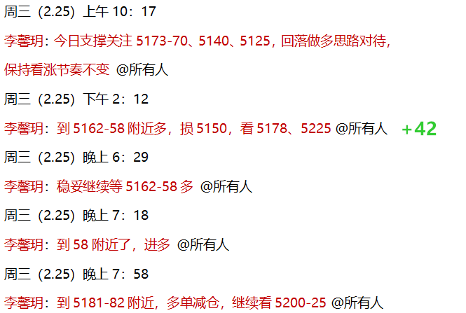 2.25 周三,欧盘公开策略黄金5160-58做多,又是精准预判回踩低点!包括昨天公开策略5094-90做多,周一公开策略5130做多,都是完美抓住回踩低点,实力已无需多言,跟上都是百点利润起步,拒绝不马后炮!实盘中,同样安排了黄金5160-58多单,顺利到5200目标,斩获42点利润!