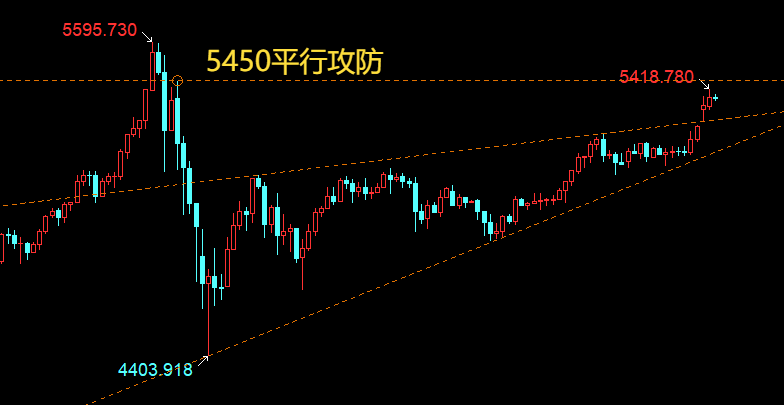 日内实际高开高走至5420,19点收线4H图呈多头排列,晚间延续看涨;短线支撑5370,强支撑4H-MA5-5350;短线阻5420,强阻5450平行攻防,破位上看5596;