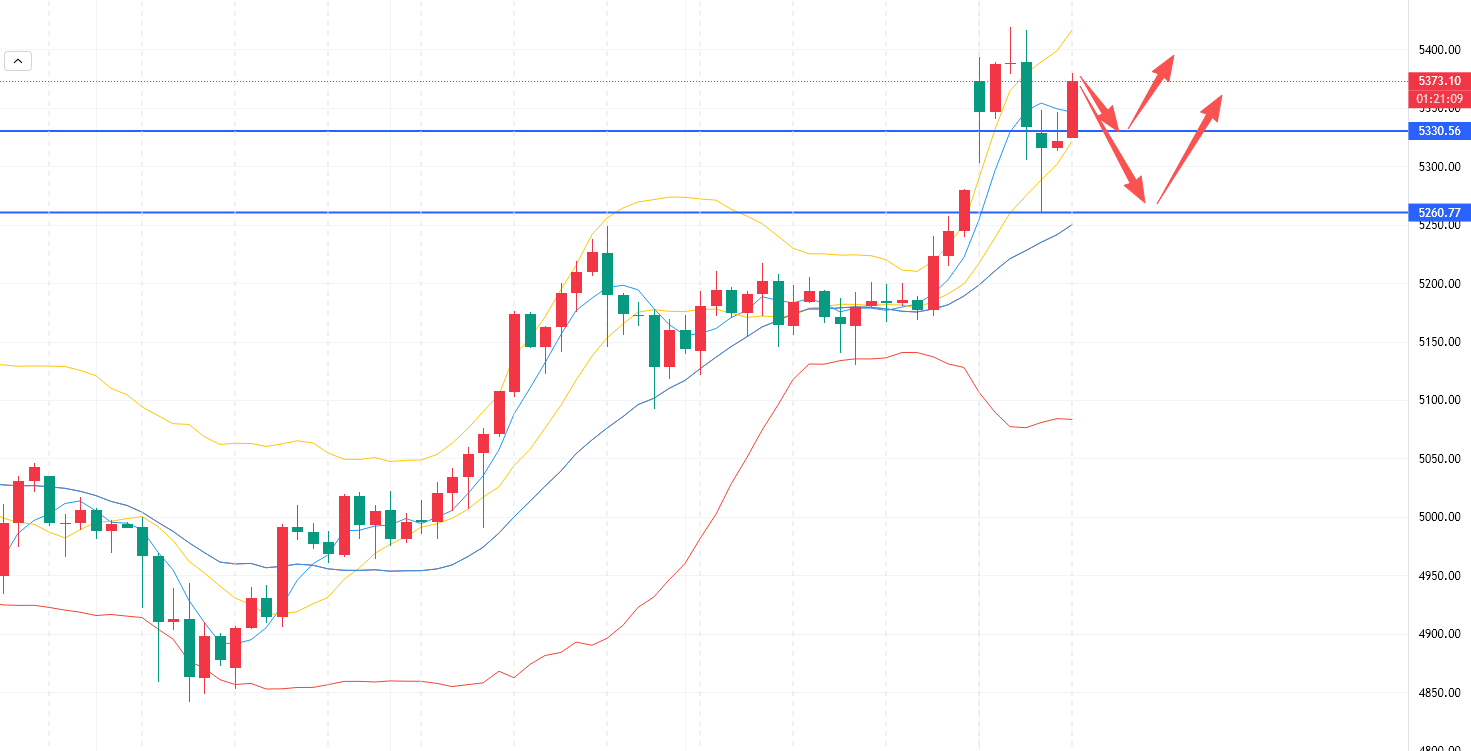 下方支撑短期关注5325附近,回落触及可以短多。假设继续震荡洗盘,见到5260强支撑也是多。上方目标短期看向5420附近,有效突破看向5450-5500区域强阻。