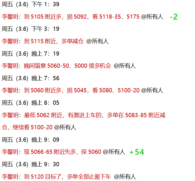 3.5 周四,黄金白盘策略5120做多,晚间策略5090-85做多,点位全部兑现,触及后都大幅拉升,看到跟上就是利润!实盘中,午后先是安排了5147-45多单,反弹5156贪利润未出,遇急跌扫损!而后又安排了5134多单,以及提前计划的5120多单进场,顺利到5170-75目标止盈!晚间又按策略,安排了5090多单,到达5126目标止盈!今日操作虽然有止损,但实盘整体仍有不错收获!