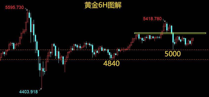 黄金,年初价格自5596快速抛售4404回升,后受地缘危机提振慢涨,二次冲高5420后抛售5000;目前处于盘整周期,国际市场不确定较强,技术面有回踩5000需求,中期理想买入节点在4800下方;周五非农利好,价格仍未突破区间;