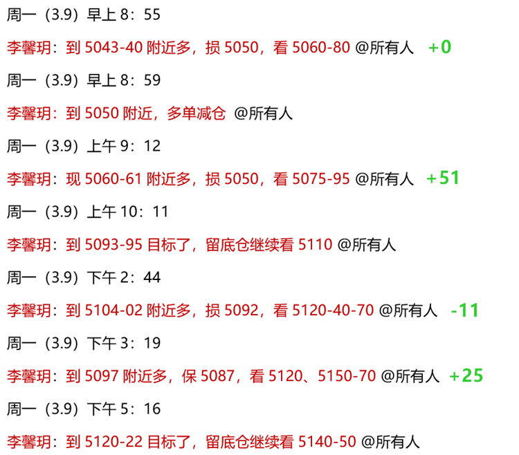 3.9 周一,黄金根据周评回落接多思路,实盘中,早间等下探回升后,安排了5040多单和5061多单,顺利到达5110目标止盈!午后安排了5104-02多单,但遇急跌扫损离场!而后继续安排了5097多单,目前到5130附近获利减仓,持有底仓博弈更大利润!今日已四连多,虽然有止损,但无伤大雅,截至目前已斩获65点利润,开门红!