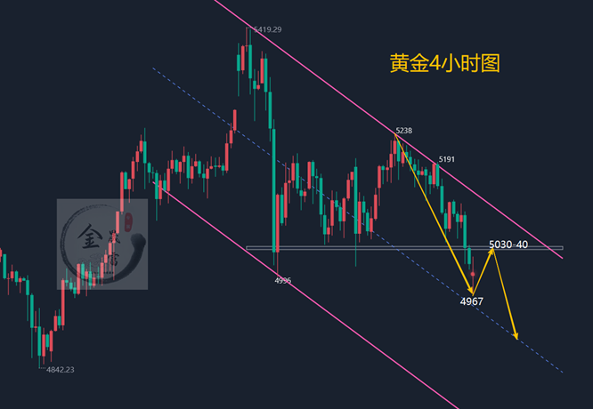 技术面来看,金价连续下破短期均线与关键支撑,日线级别空头排列清晰,5030美元由强支撑转为强压力。4小时图上,反弹力度持续减弱,下行通道保持完好,暂无明显止跌信号,下方空间逐步打开。目前1小时图已跌破5000美元关口,行情进一步走弱。上方短期压力关注早盘高点5030,及5055、5065区域,在此压制下方,继续维持空头思路。下方重点关注60日均线、大三角下沿及春节前低点4850,其次是2月次低点4650附近,若短期强弱分界线意外上破,短线行情将转强,金价有望回升至5100美元上方。只要无法站稳5100,依旧以冲高回落为主。操作思路还是反弹5030附近继续做空即可!下方看向4950—4850美元,若失守将加速下探。严格设置止损,不盲目抄底。当前趋势明确转弱,守住5040压力位,回调行情仍将延续,务必做好风险控制,谨慎参与反弹。综合来看,今日黄金短线操作思路上金晟富建议反弹做空为主,回调做多为辅,上方短期重点关注5050-5060一线阻力,下方短期重点关注4900-4850一线支撑,各位朋友一定要跟上节奏。要控制好仓位及止损问题、严格设止损,切勿抗单操作。具体点位以盘中实时为主,欢迎前来体验,交流实时行情,进群关注实时单。