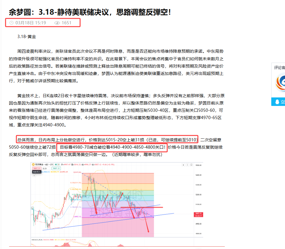 3.18-黄金全网5010看空趋势目标4900-4800